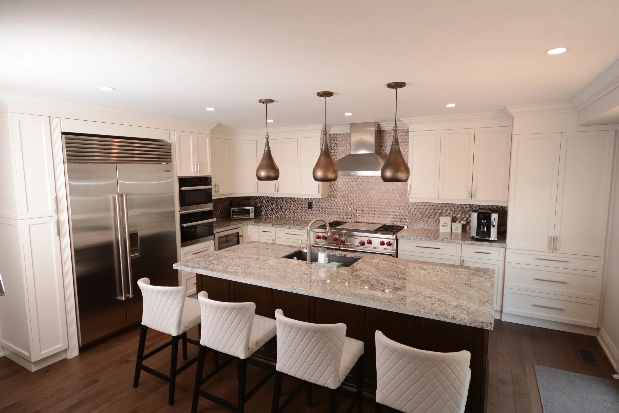 The outdated kitchen was reconfigured and moved from the front entrance area to beside the garden doors and deck. It is now a communal gathering space that welcomes visitors inside the home. The back-split lends itself to multi-level and cross-generational entertaining.